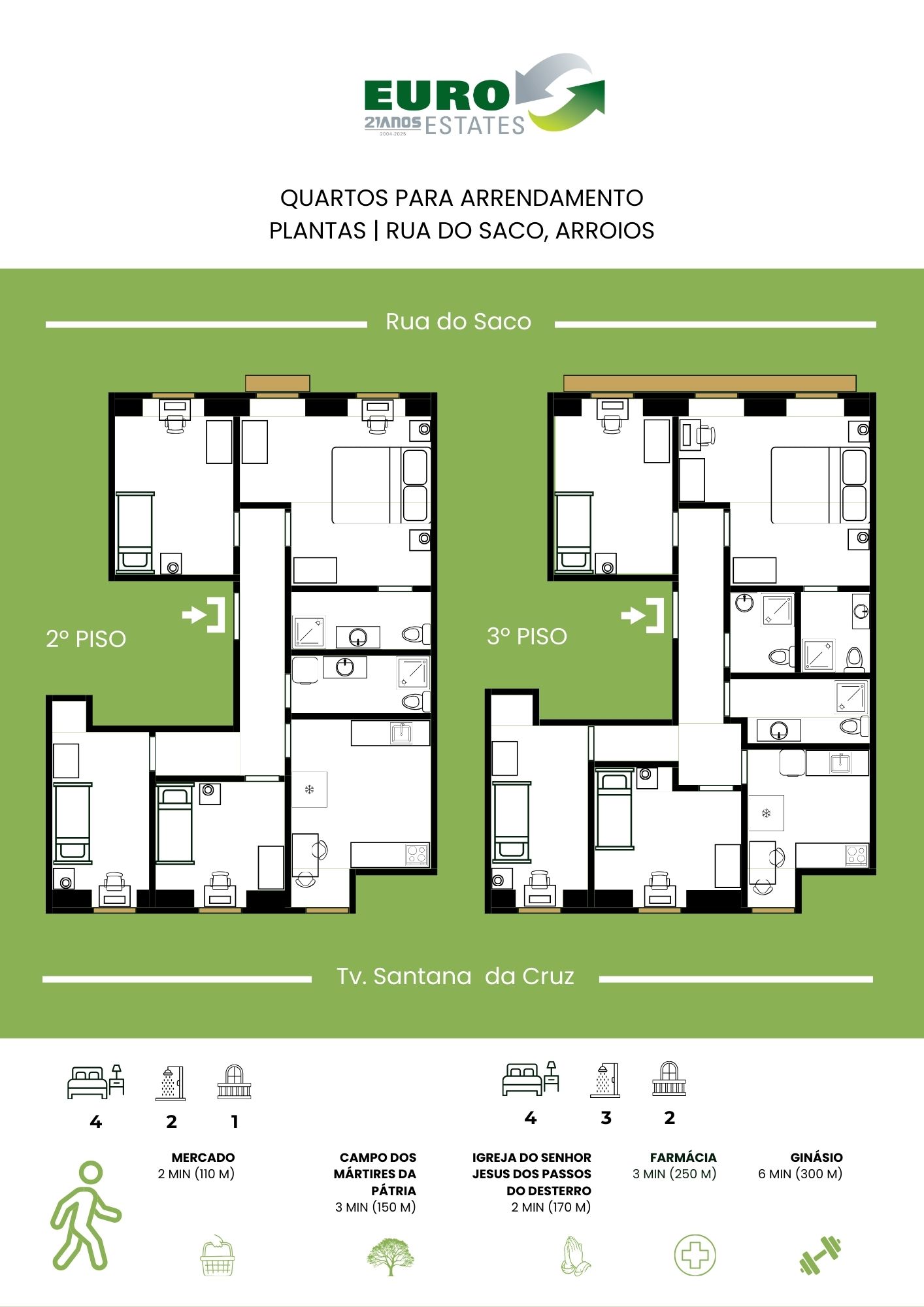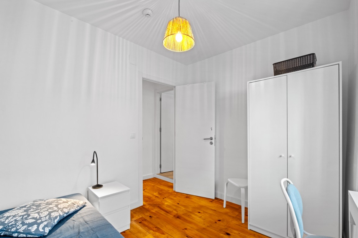 Residência com 8 quartos distribuídos por 2 pisos, preparado para alojamento de estudantes em regime de arrendamento de médio prazo. Com 141 m2 de área útil, inclui 2 suítes, com casa de banho privativa, e 3 quartos dispõem de varanda. A cozinha encontra-se totalmente equipada com placa, forno, combinado, micro-ondas, máquina de café, chaleira elétrica, máquina de lavar e secar roupa e utensílios de cozinha. Cada quarto está mobilado e pensado para oferecer boa arrumação, incluindo cama com gavetões, armário, mesa de cabeceira, secretária, cadeira e candeeiro. Inclui também roupa de cama, com lençóis, proteção de colchão e edredão. As despesas e a limpeza das áreas comuns estão incluídas. Apartamento exclusivo para raparigas, preferencialmente estudantes entre os 18 e os 35 anos. O preço deste quarto é 540€ por mês.