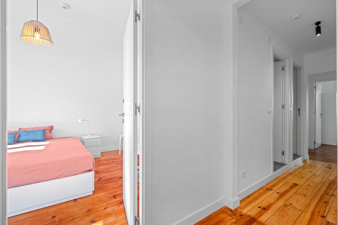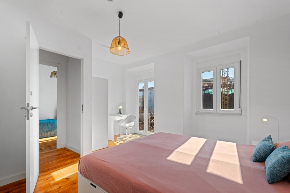 Residência com 8 quartos distribuídos por 2 pisos, preparado para alojamento de estudantes em regime de arrendamento de médio prazo. Com 141 m2 de área útil, inclui 2 suítes, com casa de banho privativa, e 3 quartos dispõem de varanda. A cozinha encontra-se totalmente equipada com placa, forno, combinado, micro-ondas, máquina de café, chaleira elétrica, máquina de lavar e secar roupa e utensílios de cozinha. Cada quarto está mobilado e pensado para oferecer boa arrumação, incluindo cama com gavetões, armário, mesa de cabeceira, secretária, cadeira e candeeiro. Inclui também roupa de cama, com lençóis, proteção de colchão e edredão. As despesas e a limpeza das áreas comuns estão incluídas. Apartamento exclusivo para raparigas, preferencialmente estudantes entre os 18 e os 35 anos. O preço deste quarto é 750€ por mês.